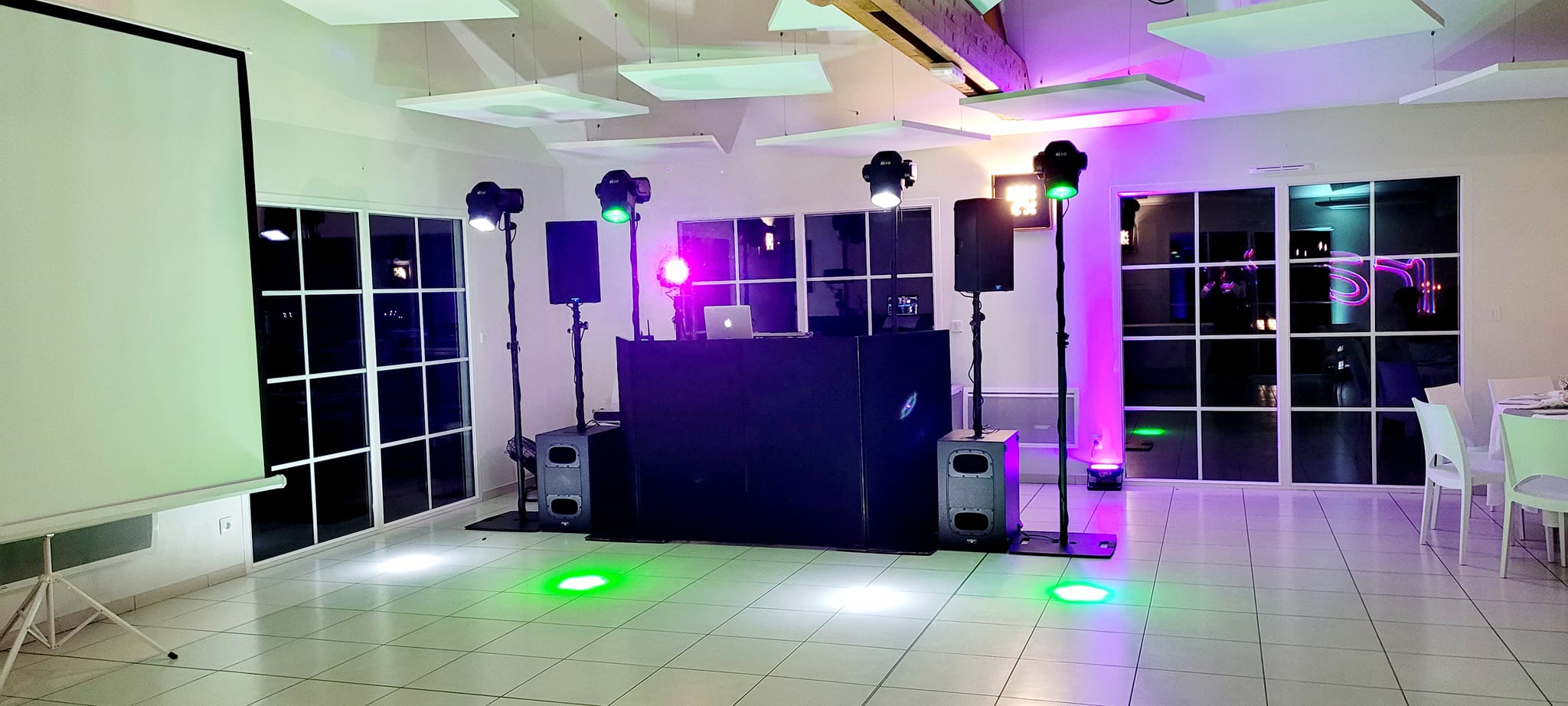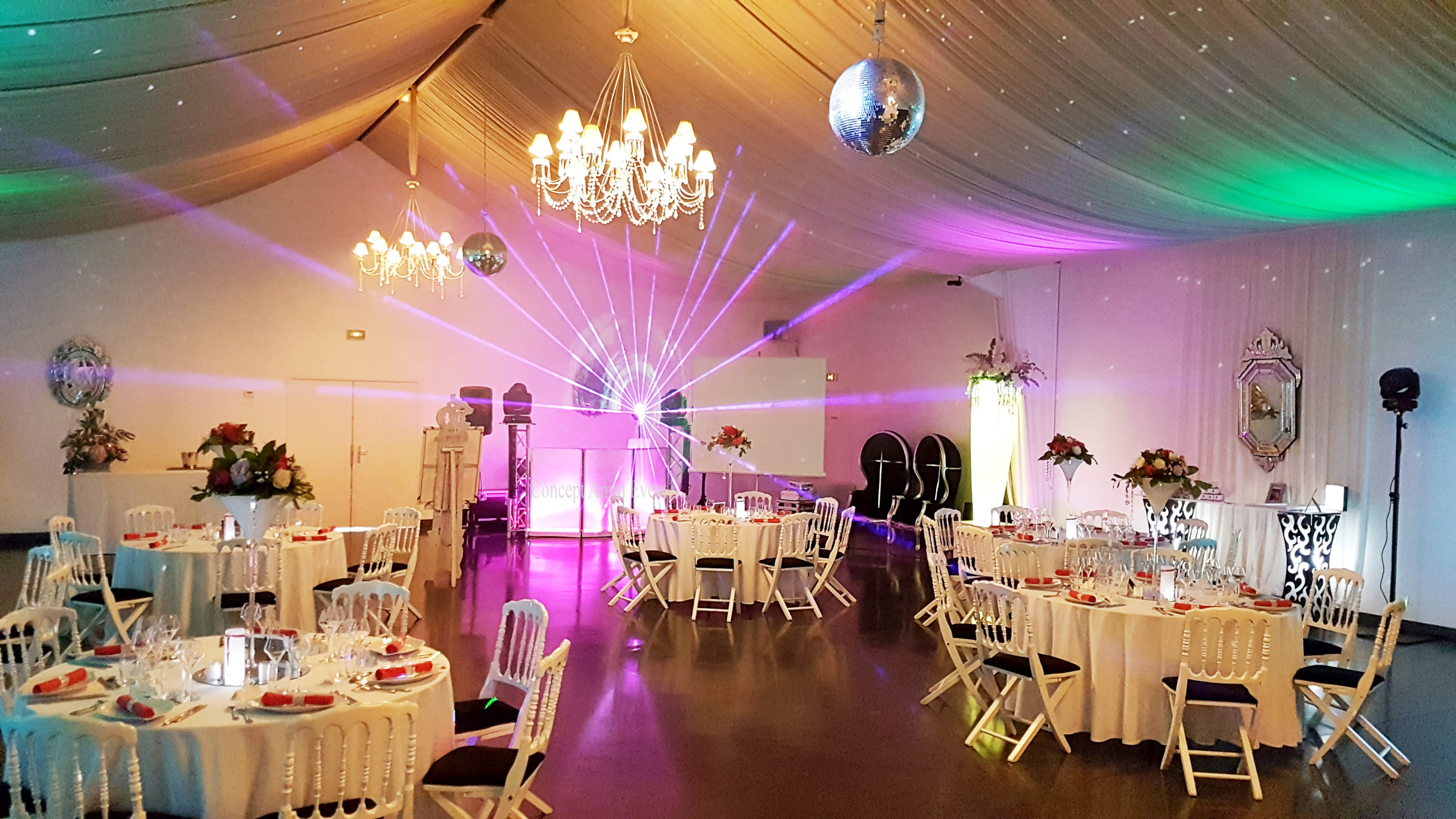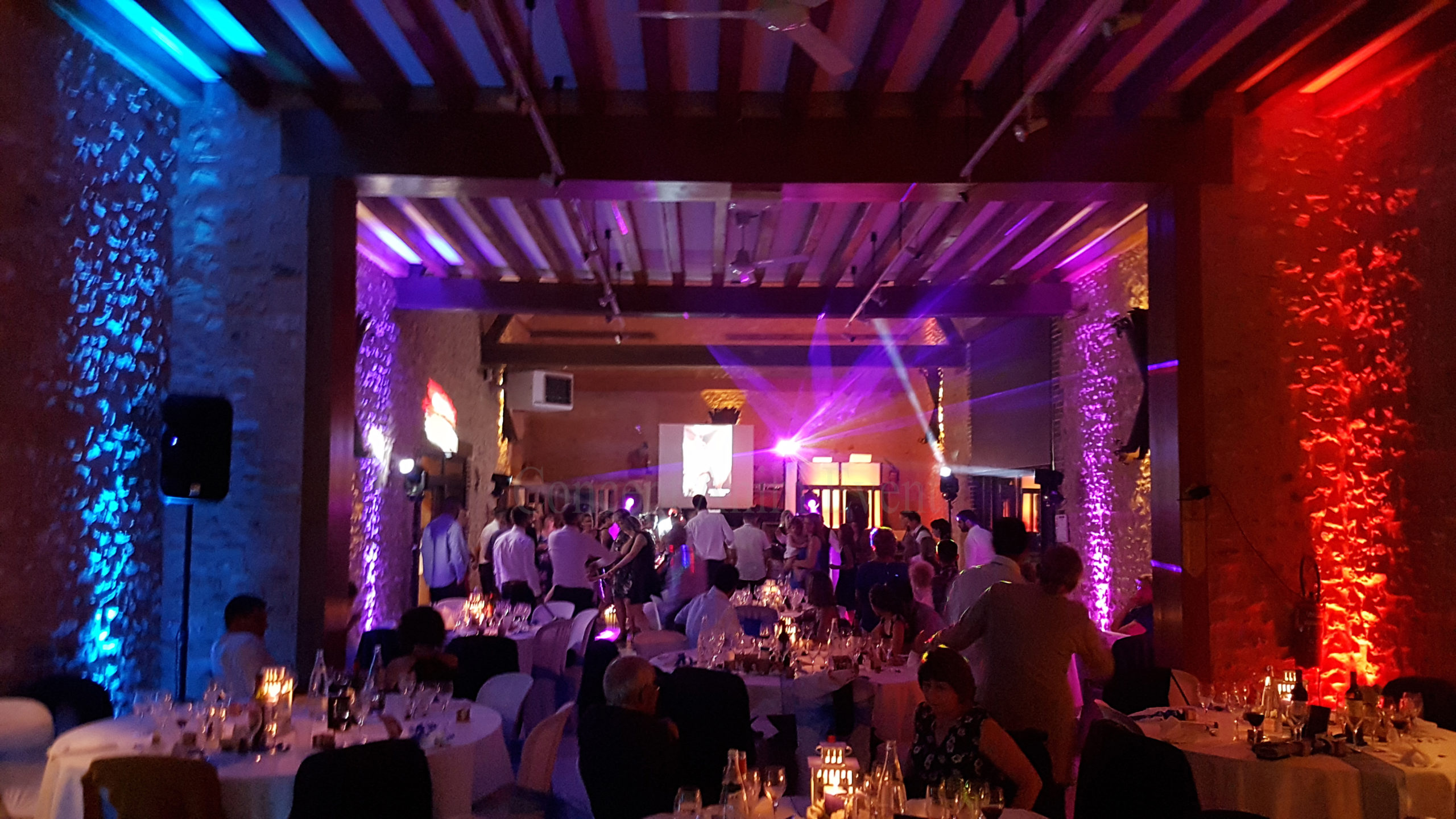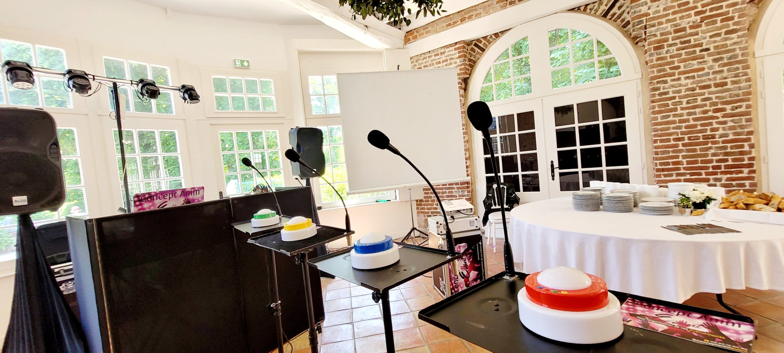 Boitier de vote (Quizz), éclairage architecturale, sonorisation cérémonie et messe, vidéo projecteur, fontaine à champagne, machine à bulle, sono portable, canon à confettis, praticable de scène, pupitre pour discourt, structure, micro HF,